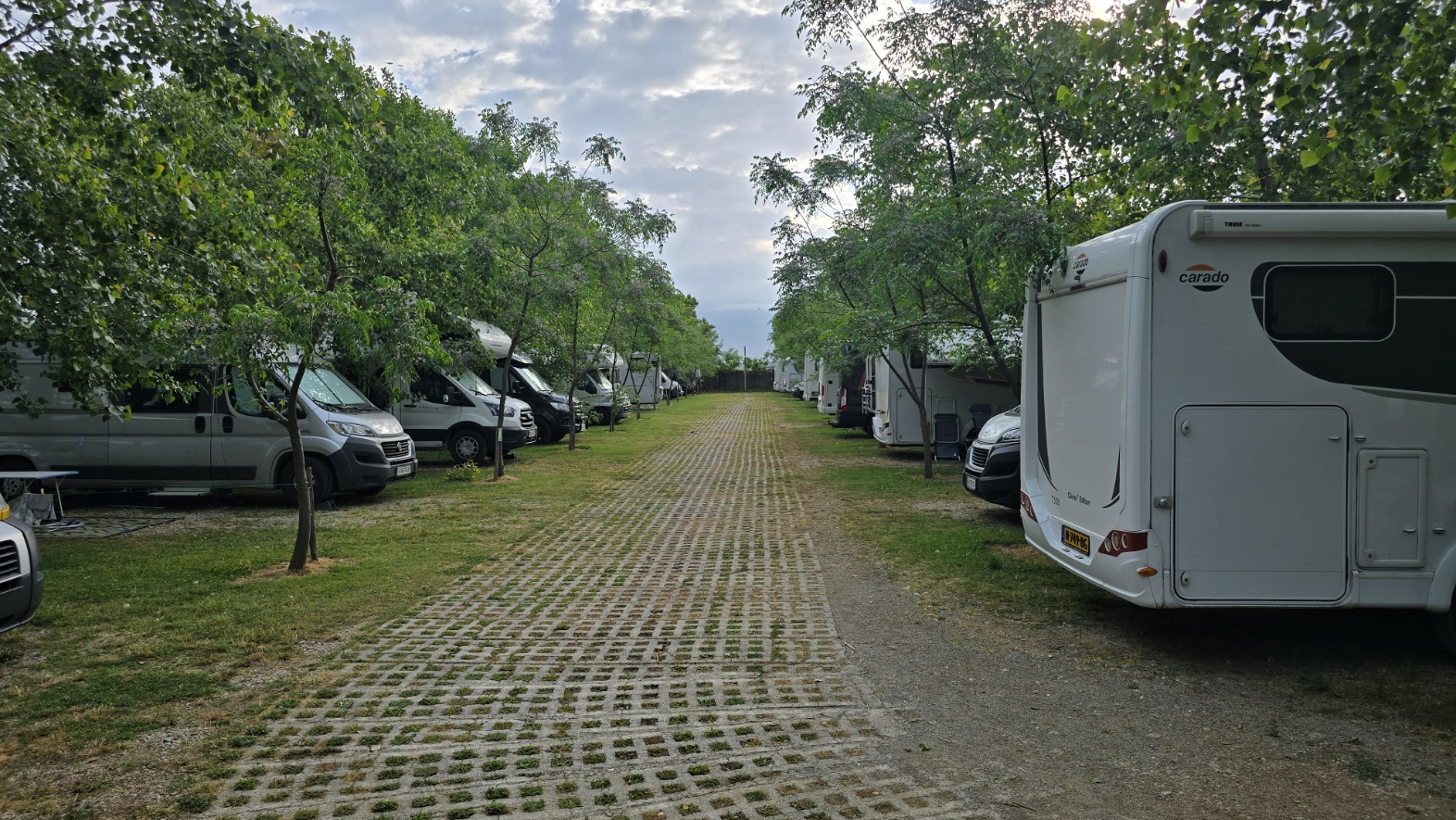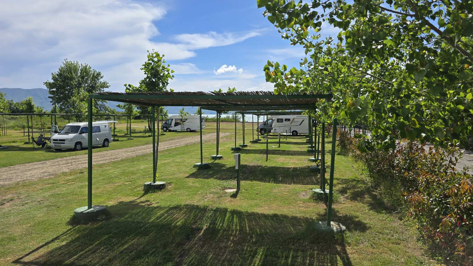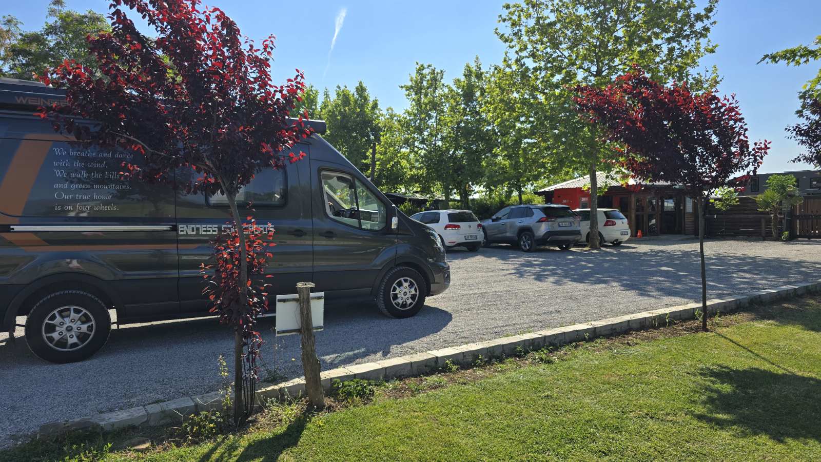 A narrow asphalt road leads to the campsite, which you turn onto from the main road five kilometers before entering the city of Shkoder. When we say narrow, we mean it—it is difficult for two campers to pass each other on it without at least one of them turning a few meters into the grass. Despite this, we also saw very large bus campers and long caravans at the campsite. The only complaint about the campsite’s organization is the access.