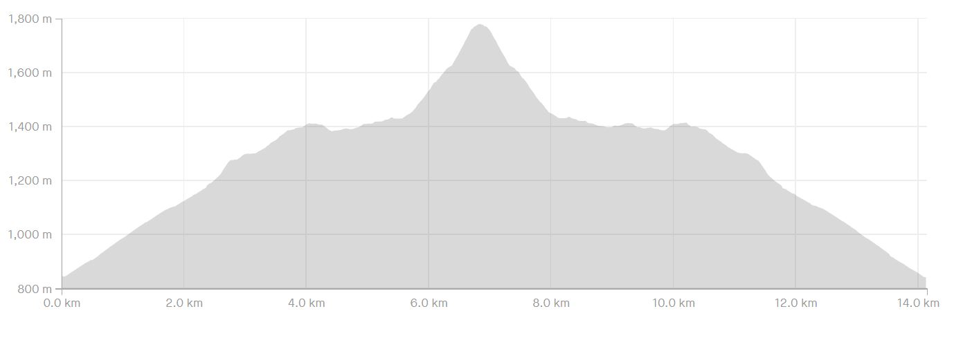 The trail is marked as medium difficult, which is correct overall. However, we would call its first part (the first two hours) easy, and then there is a very steep ascent that can rightfully be labeled difficult. You can see how steep the climb to the top is from the elevation chart.